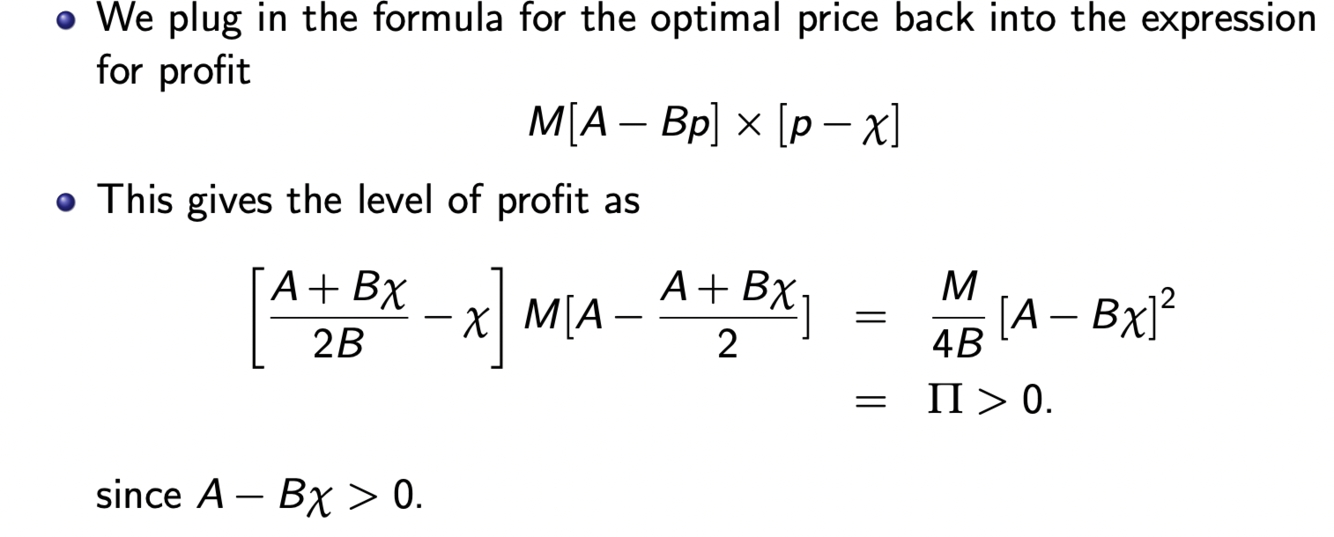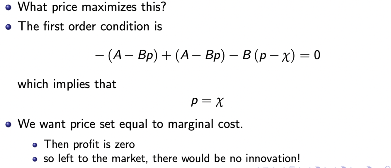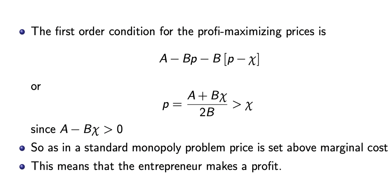 We are going to maxmise the profit function which is a quadratic and madmose with respect to P, then figure out the price the innovator can get for her product