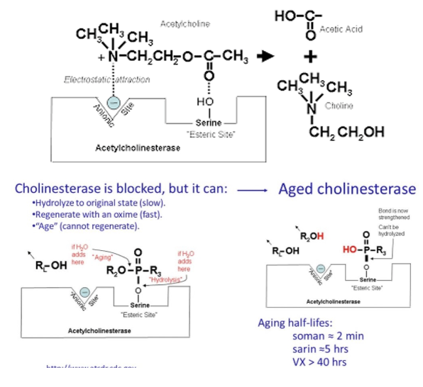 block acetylcholinesterase (as do carbamates e.g., aldicarb)