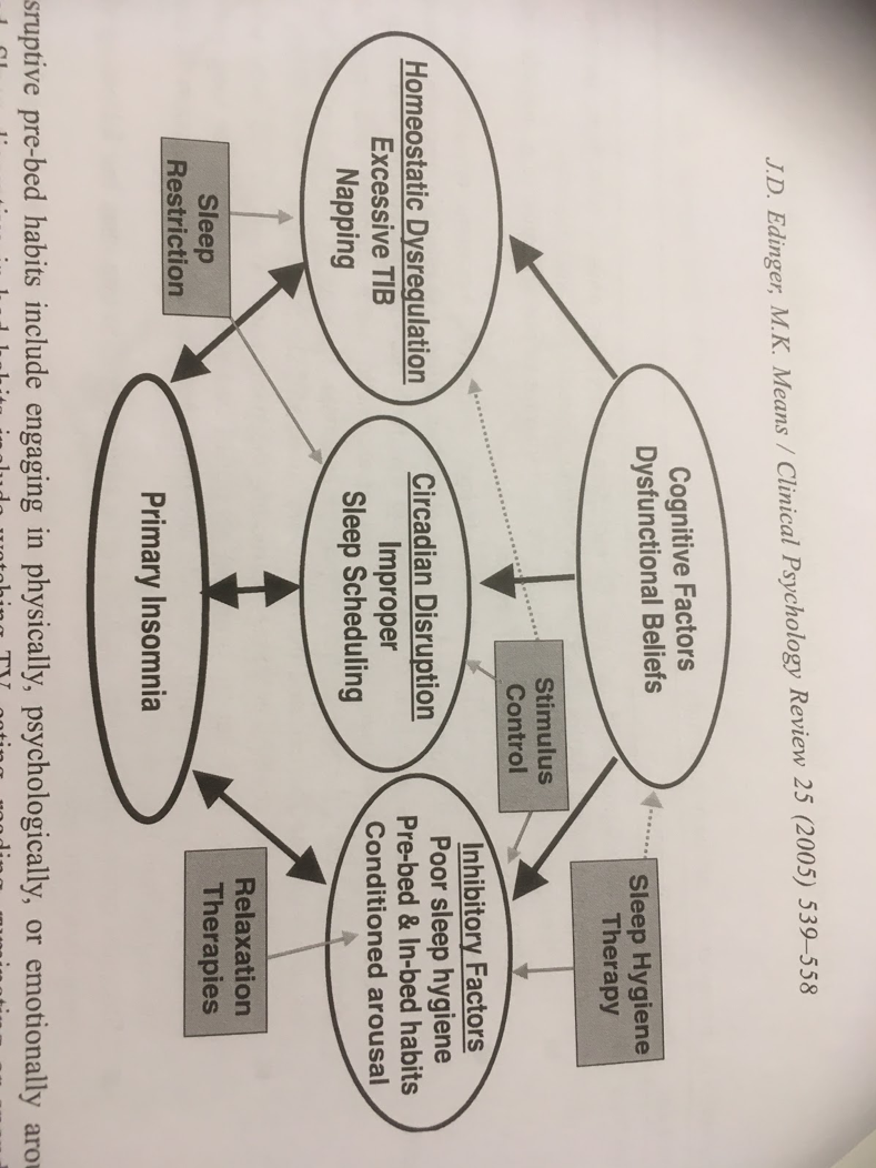 Adressera oro/ruminering, uppmärksamhetsbias för sömnrelaterade hot, ohjälpsamma idéer kring sömn, missuppfattningar kring sömn och dagaktiviteter, användandet av säkerhetsbeteenden som upprätthåller ohjälpsamma uppfattningar om sömn. Man arbetar med ovanstående kognitioner både under dagen och natten.