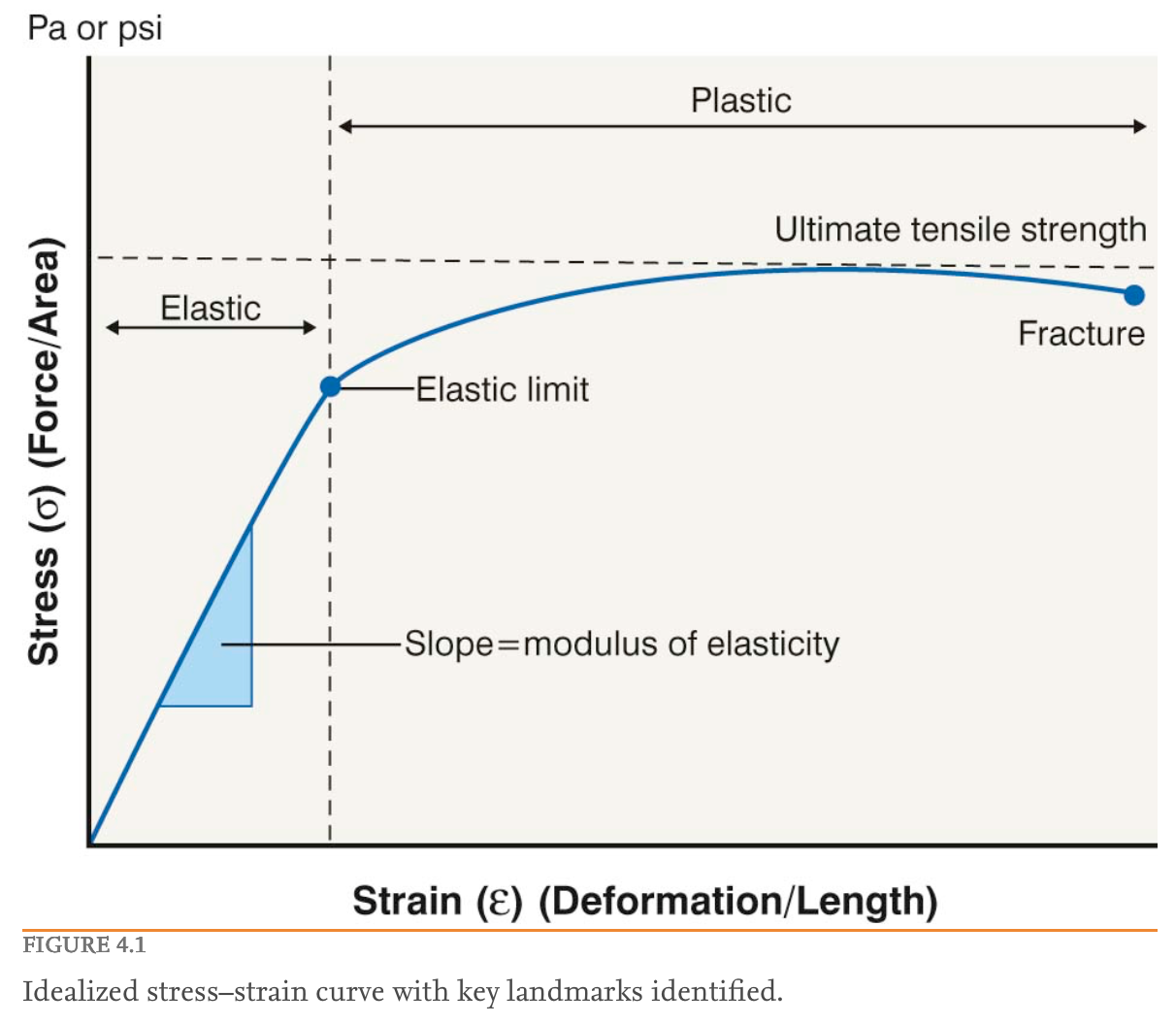 Maximal tensile strength is the highest point of the tensile strength curve and is often higher than the breaking point strength. The slope of the elastic portion of the curve is called the modulus of elasticity . This reflects the material’s resistance to elastic deformation or tensile stiffness . The modulus of stainless steel used in suture needles, for example, is approximately 200 GPa. The moduli of elasticity of suture materials are in the range of 0.5–3 GPa