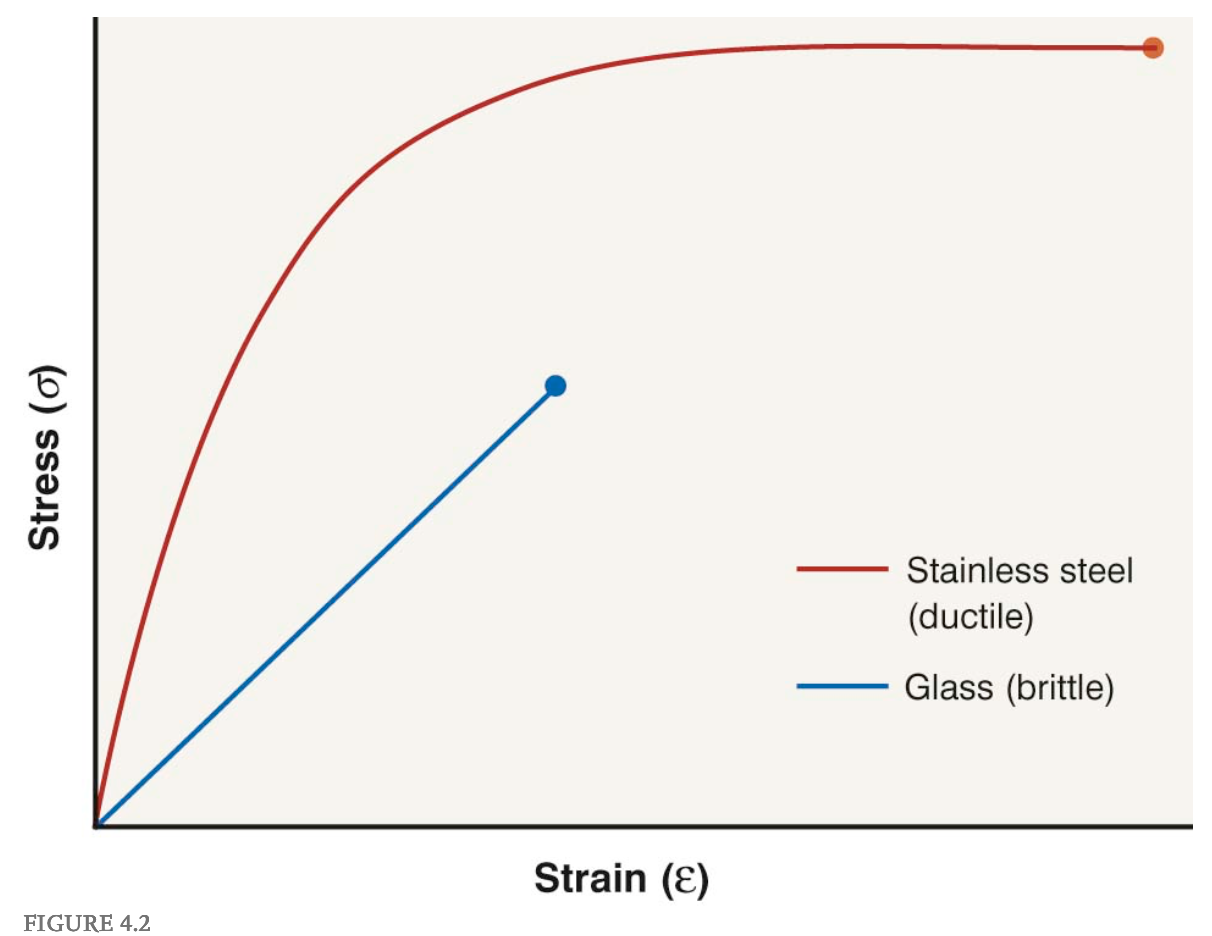 A classic dichotomy contrasts a ductile material, such as stainless steel, versus a brittle material, such as glass ( Fig. 4.2 ). Once glass reaches its elastic limit, it will break instead of undergoing plastic deformations. Stainless steel, on the other hand, is ductile and able to withstand a great degree of elongation beyond its yield point.