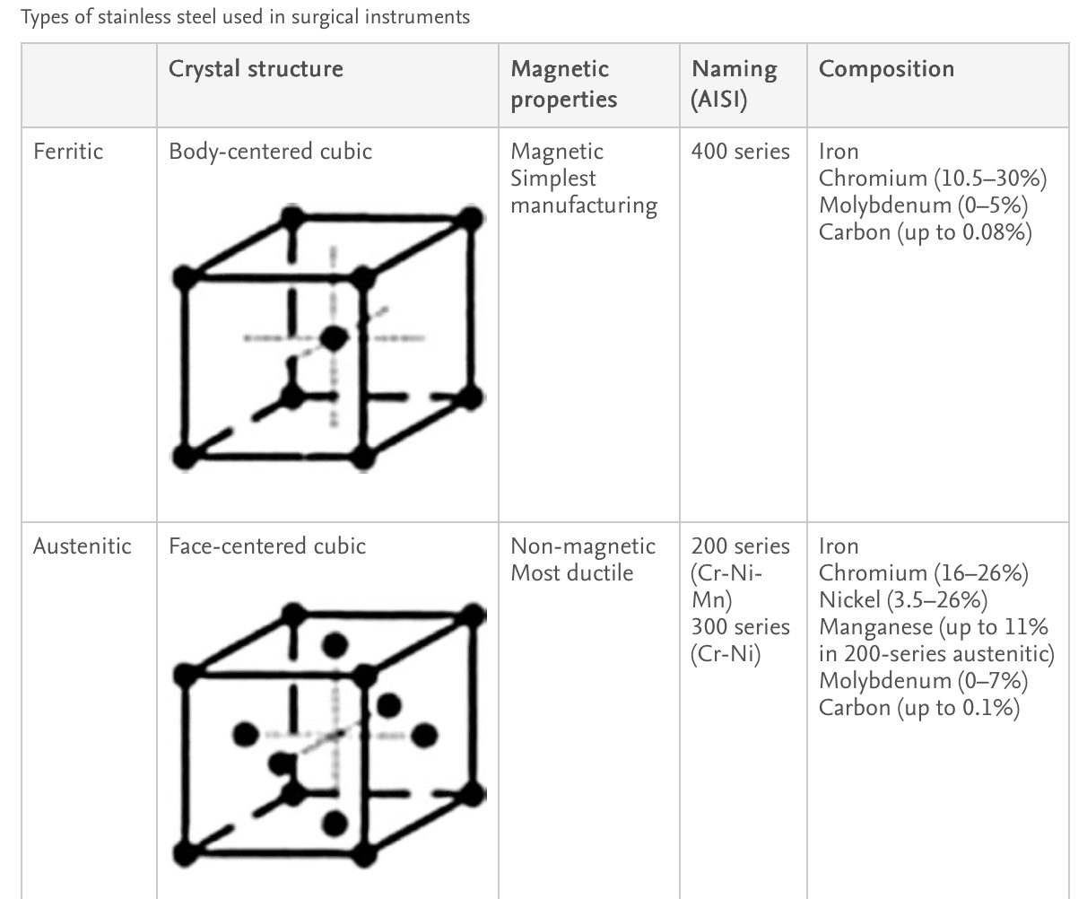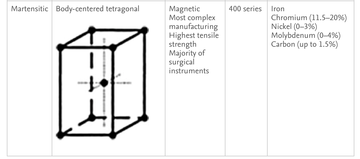 If ferritic steel is heated above 900°C and then cooled quickly (a process called quenching ), it can form a structure in which the cube is stretched in one direction (body-centered tetragonal) and is saturated with carbon: martensite . In its “as-quenched” form, martensitic steel is very brittle, making it difficult to form. Further heat treatments ( tempering ) improve ductility and are a mainstay in the production of martensitic steels. Martensitic steels are the most used in dermatologic surgery instruments.