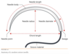 There are four main grips to holding the needle driver: thumb/ring finger, thenar, palmed, and pencil. The needle should usually be placed perpendicular to the driver jaws, being careful not to damage the tip or swage.