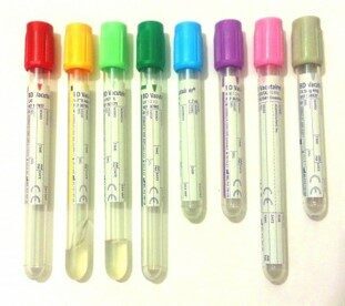 - Purple = EDTA - for haematology - FBC, ESR, HbA1C