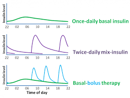 Mix of short and intermediate acting before breakfast, short acting before lunch, and intermediate at bedtime