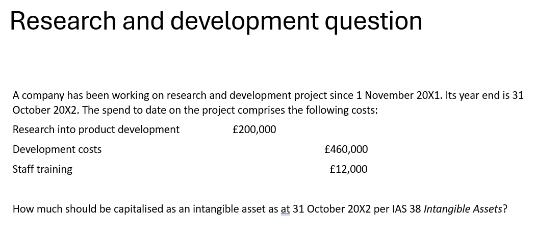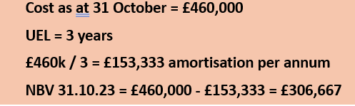 Sales of the product commenced on 1 November 20X2, and it is expected that the product will have life of three years, with a residual value of fnil. What would be the net book value of the asset as at 31 October 20X3 per IAS 38 Intangible Assets?