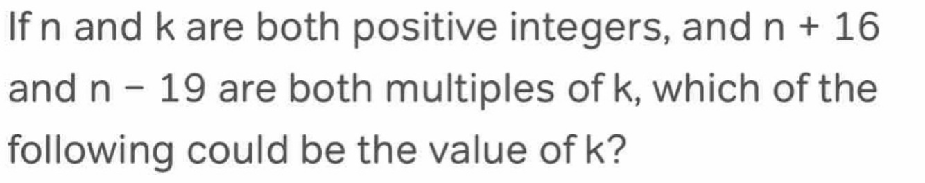 Answer = 7 (16-(-19) = 35, which is a another multiple of K and is divisible by 7, so 7 is the answer.
