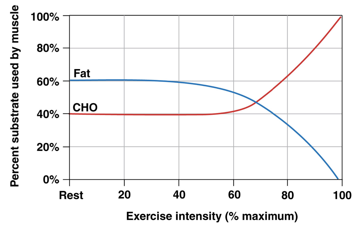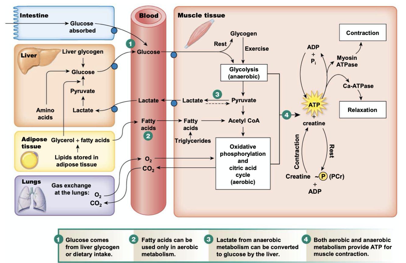 Carbohydrates and fats - Aerobic metabolism is most efficient through glycolysis-citric acid pathways, but requires oxygen, used for long term endurance exercise - Anaerobic (glycolytic) metabolism is faster, pyruvate to lactate, fatty acids not used, but less efficient than aerobic