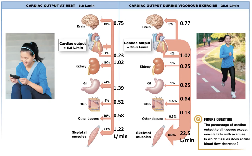 Distribution of blood flow shifts towards muscle (local control can increase blood flow to a specific region)