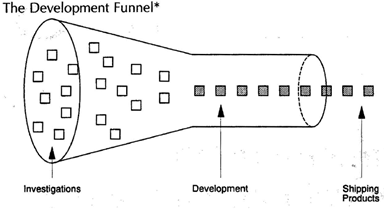 The development funnel is a description of how an organisation identifies ideas, screens, reviews, and finally converges on the content of development projects being funded.