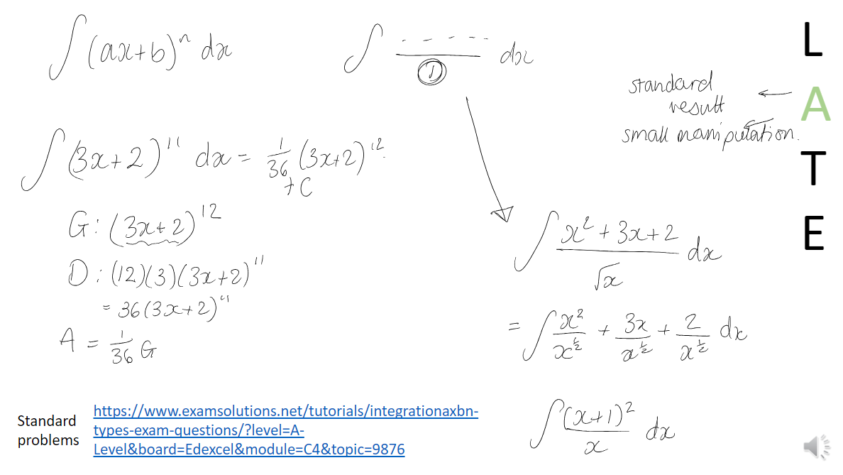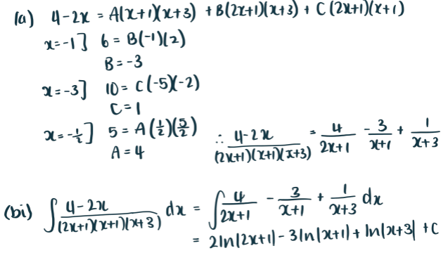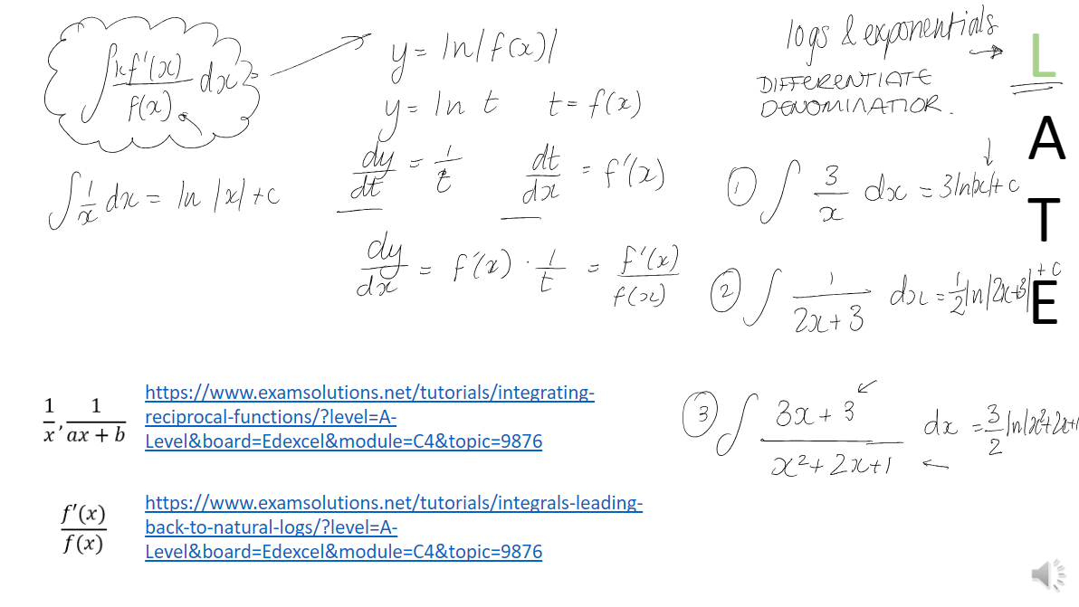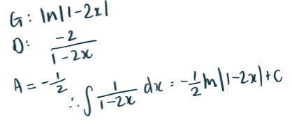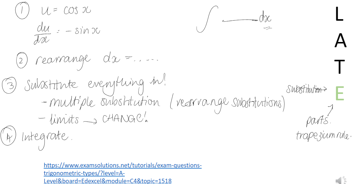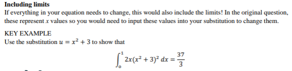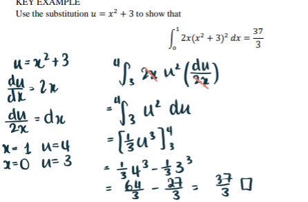 2) same as the other integrations differentiate u and make dx the subject, if you are given limits substitute them into u = to get the new limits