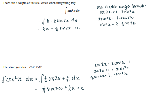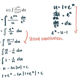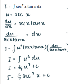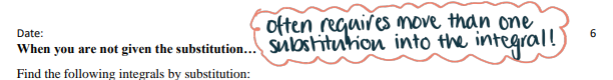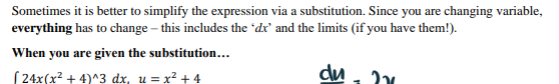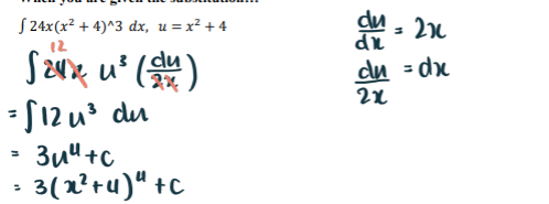 6) adjust the u equation to solve for this number and then substitute that answer back into the integration (this is the second substitution)
