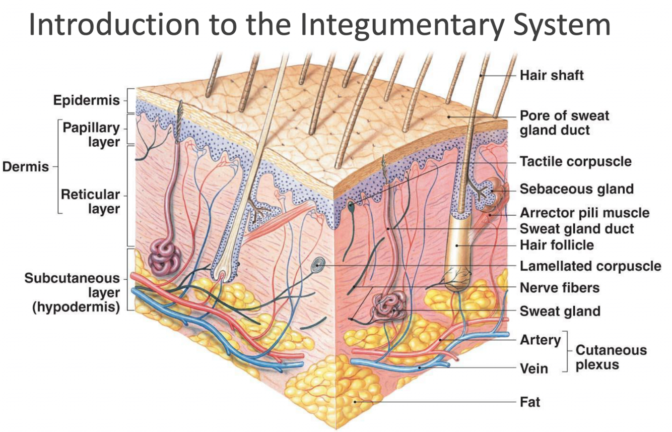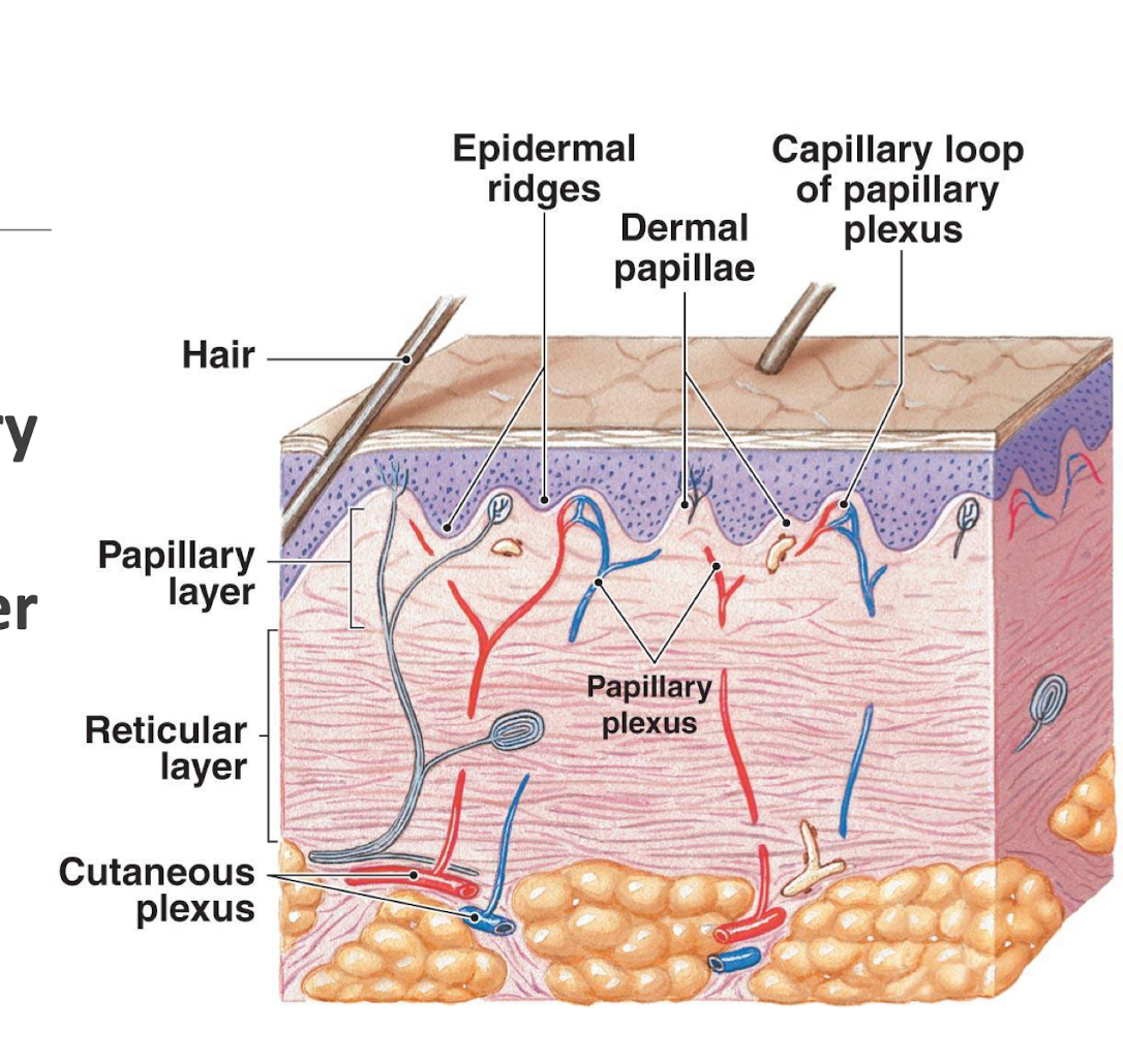- contains larger blood vessels, lymph vessels, and nerve fibers (lamellated pacinian corpuscles), exocrine sweat glands, hair follicles.