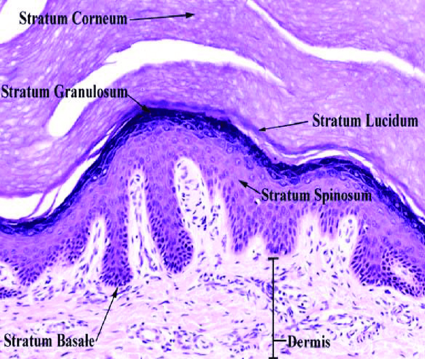 Keratinocytes are produced by mitosis of stem cells in the stratum basale layer of the skin. Newer keratinocytes push older ones towards the surface. Keratinocytes begin to mature and produce keratin in the stratum spinosum. These keratinocytes are still undergoing cell division. By the stratum granulosum the keratinocytes have flatted and accumulate keratohyalin granule, and undergo apoptosis. Keratinocytes in the stratum corneum are all dead.