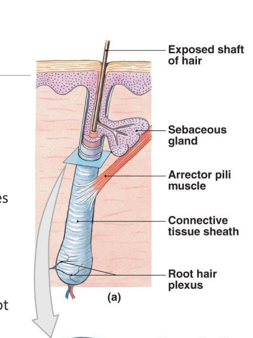 hair shaft Visible part of the hair, extends above the skin. Within the dermis called hair root.