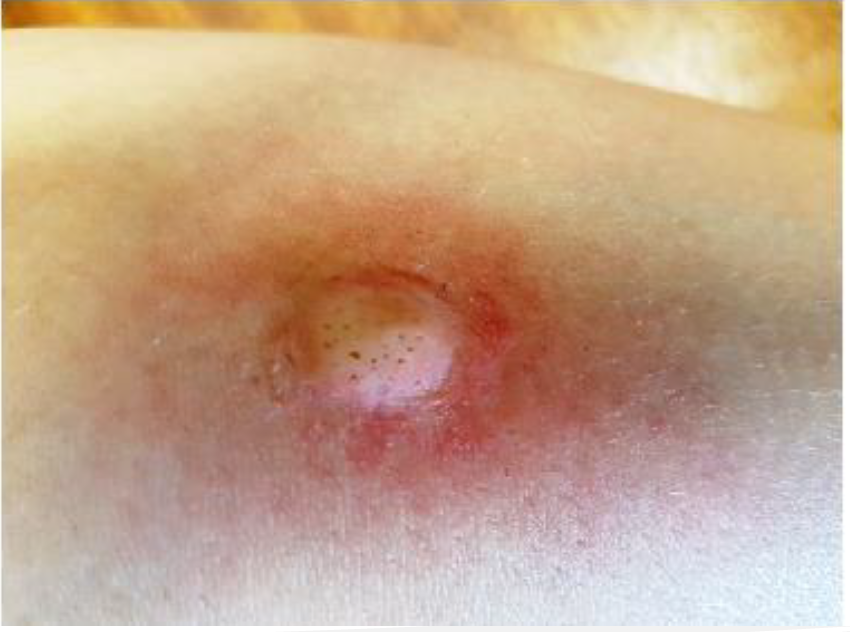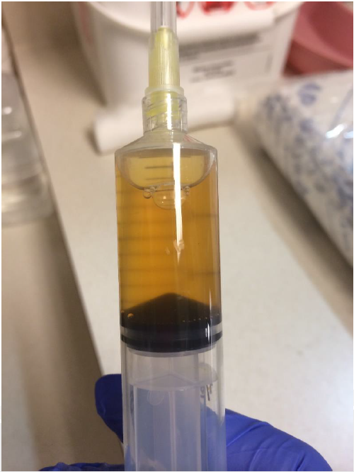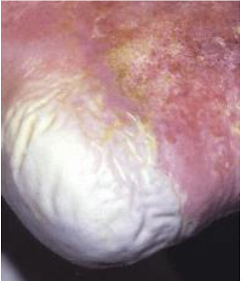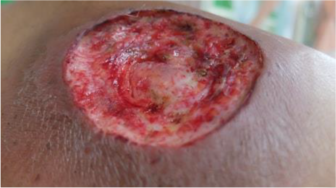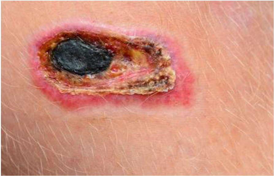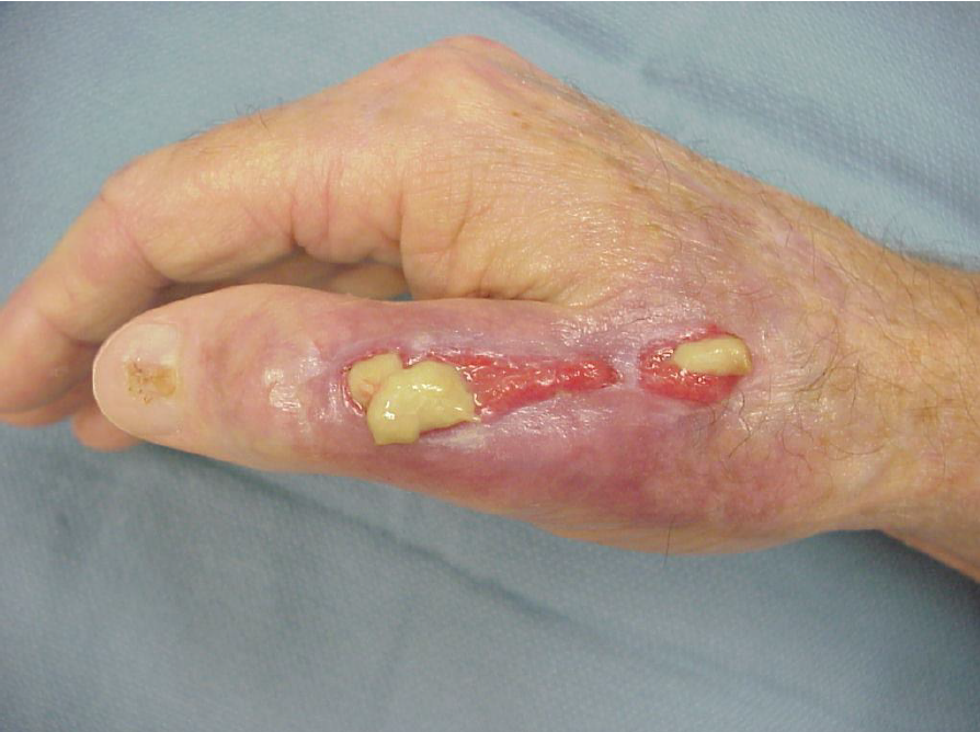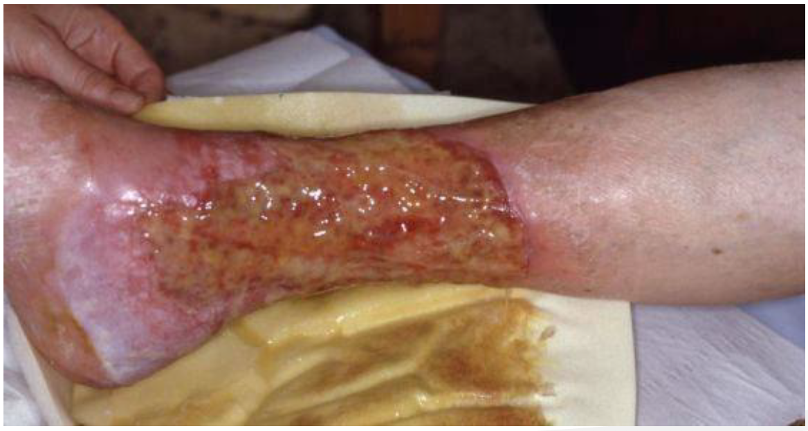 Thick Yellow, green or brown wound drainage that often has a foul odor, typically a sign of infection.
