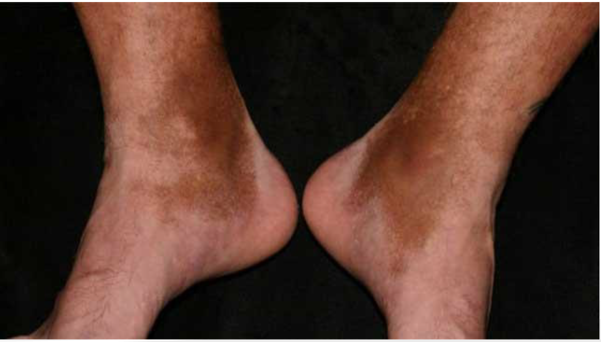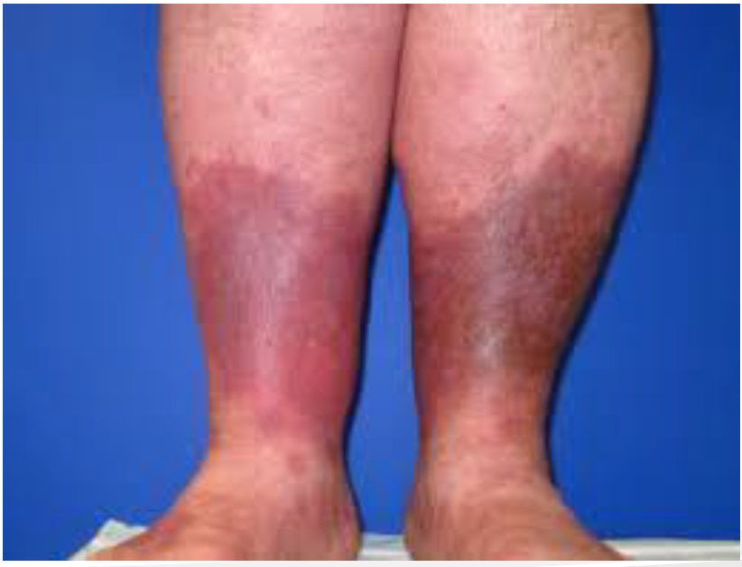 Subcutaneous tissues of the ankle and lower leg in persons with venous insufficiency (fibrotic thickening with hemosiderin staining).