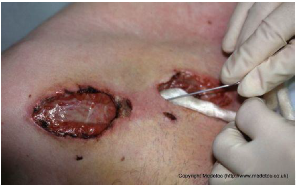 Tissue destruction along wound margins in a narrow area that may extend parallel to the skin surface or deeper into the body.