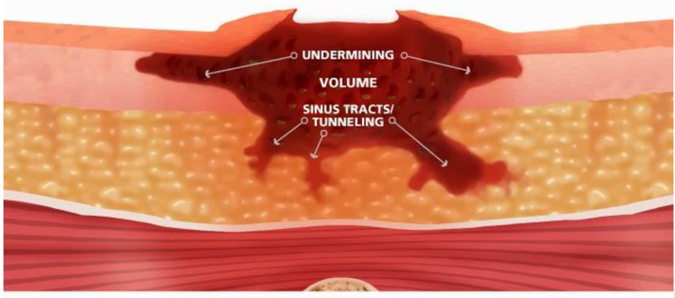 Area of tissue under wound edges that becomes eroded; results in a large wound beneath a smaller wound opening