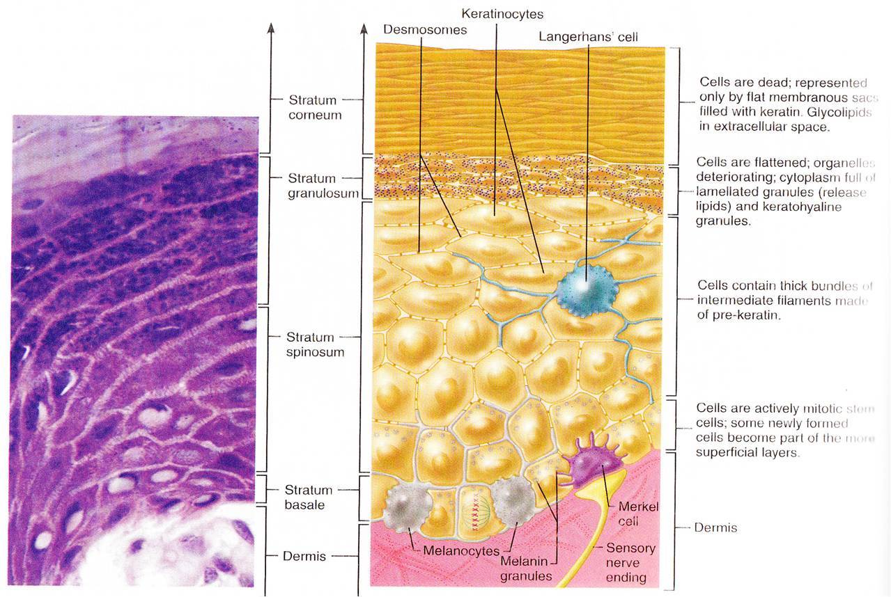 Protects against sun ultraviolet-ray damage. This thick layer appears only in frequently used areas such as palms of the hands and soles of the feet. Thick skin epidermis has all five strata.