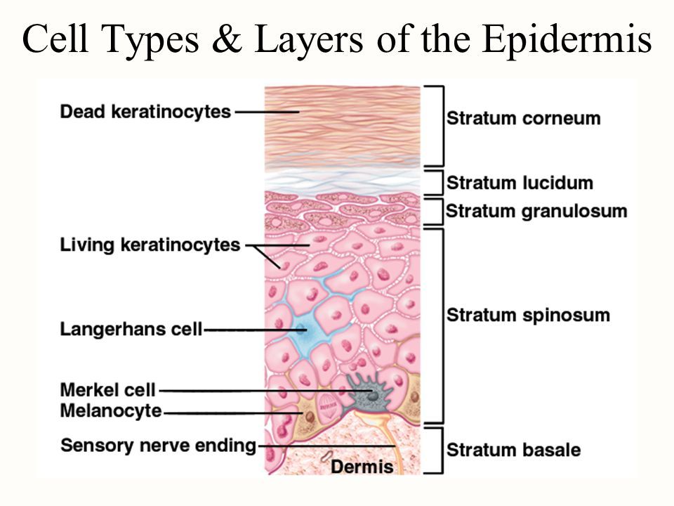 1) Keratinocytes 2) Melanocytes 3) Langerhan cells 4) Merkel cells