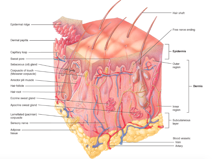 The hypodermis (subcutaneous) is a layer of areolar connective tissue and adipose tissue that anchors the dermis to the underlying tissues.
