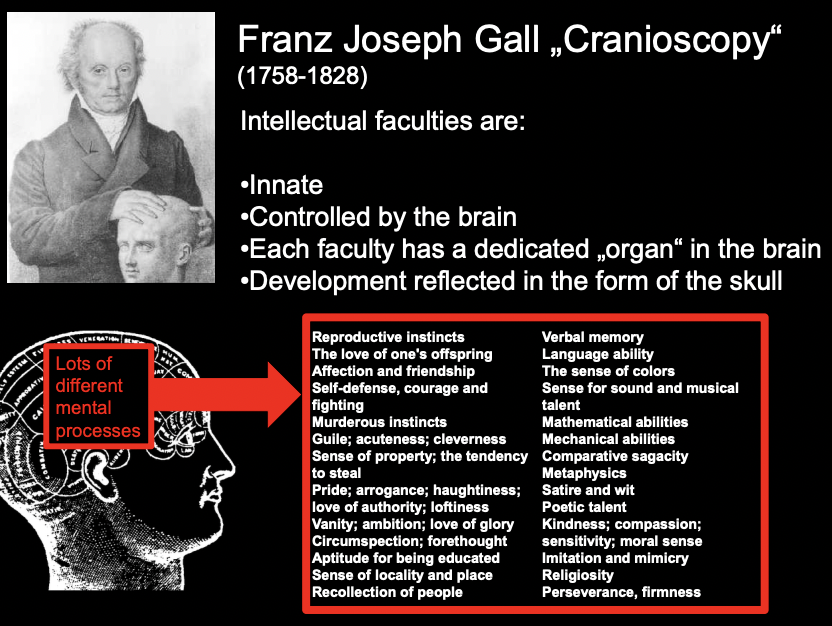 Outdated model. In Franz Gall’s ‘cranioscopy’: he thought each intellectual ‘faculty’ has a dedicated ‘organ’ in the brain