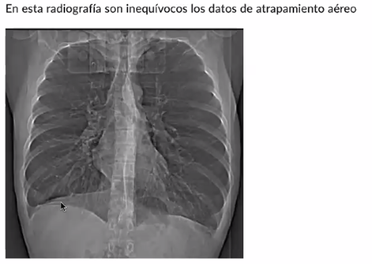 Hallazgos radiográficos: hemidiafragmas abatidos y aplanados, hiperluminosidad en ambos campos pulmonares con opacidades lineares bibasales y horizontalización de arcos costales, arco pulmonar abombado.