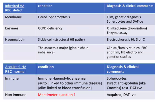 Give examples of inherited and acquired haemolytic anaemias.
