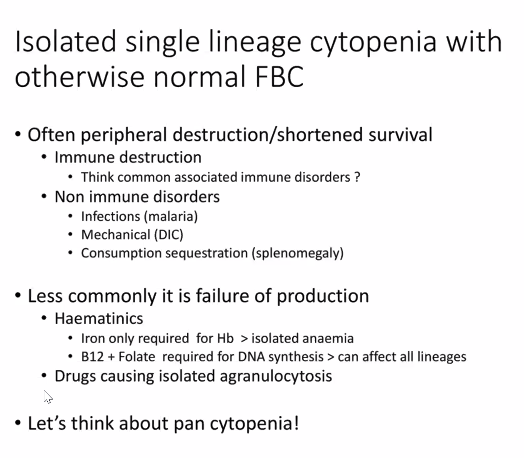 What causes an isolated single lineage cytopenia with otherwise normal FBC?