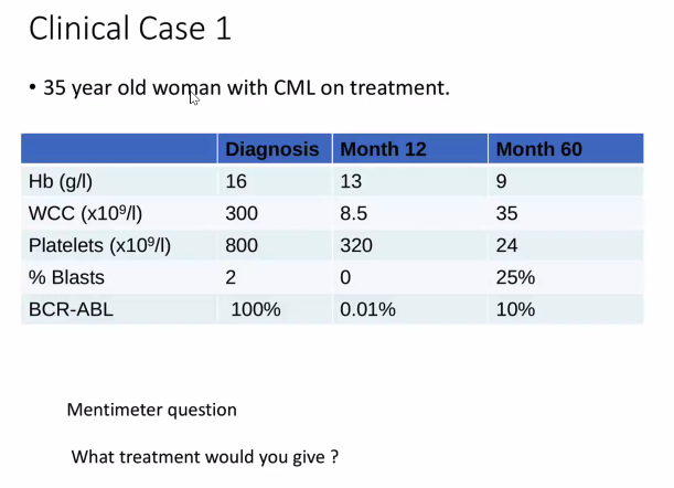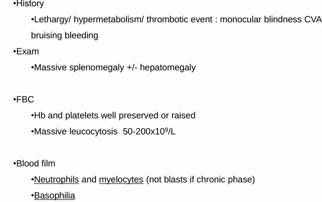 What is the hx, exam, FBC and Blood film finding in CML?