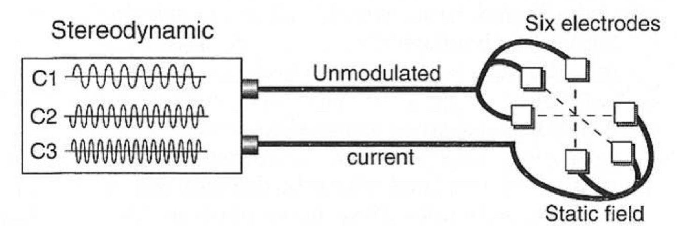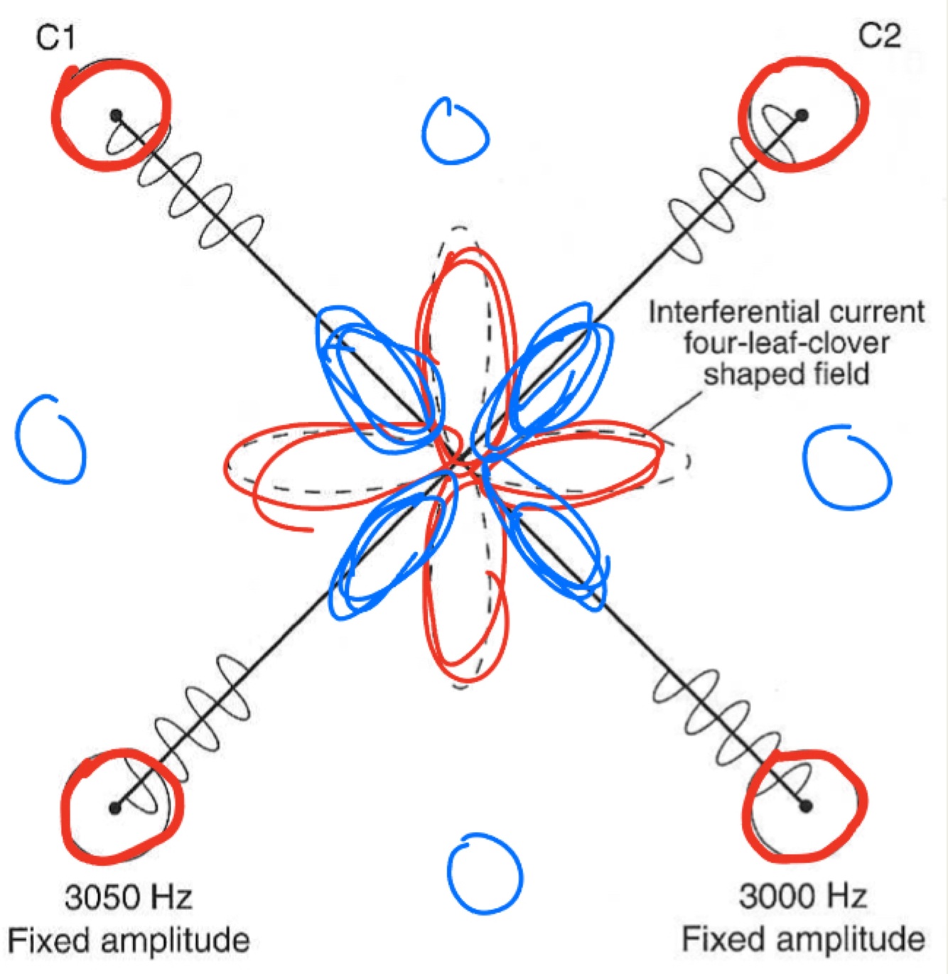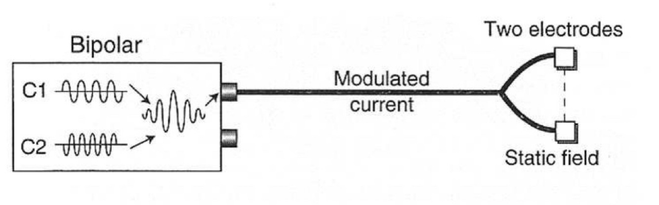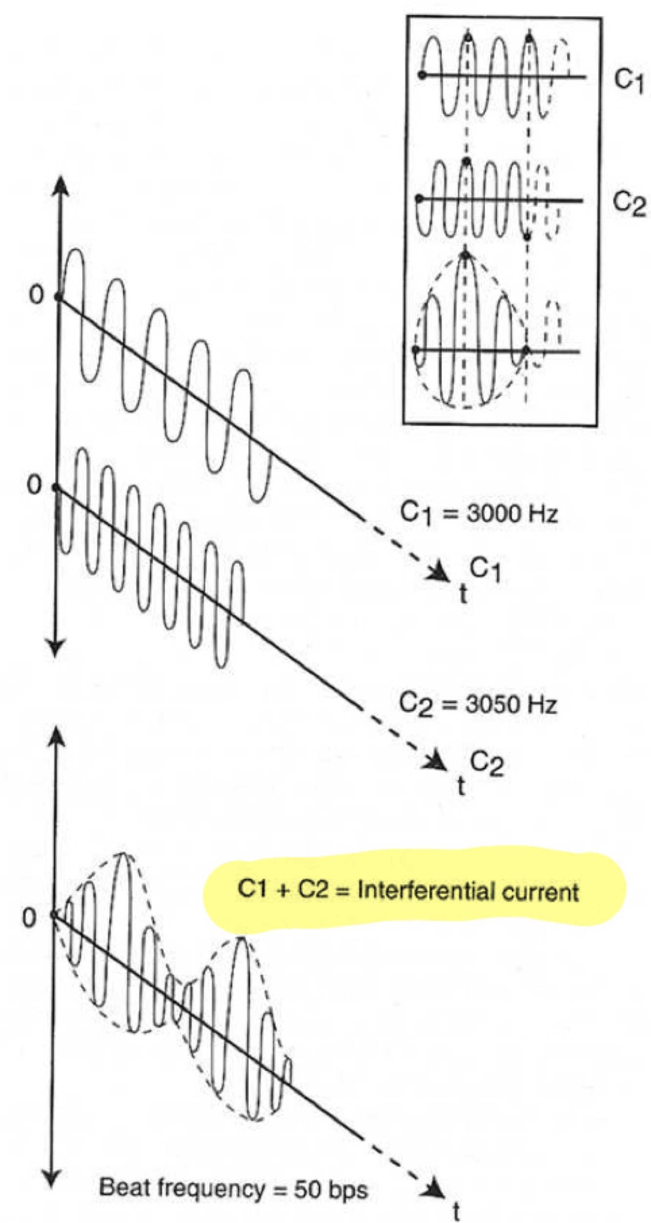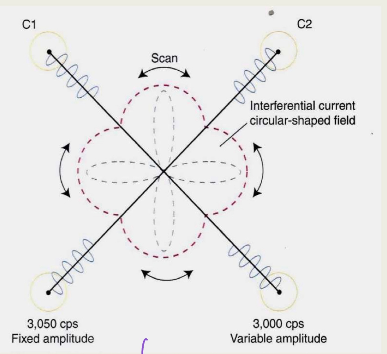 It results from the interference caused by the crossing of two or three MEDIUM frequency (3000 - 5000 cps) alternating sine-wave currents with different carrier frequencies.
