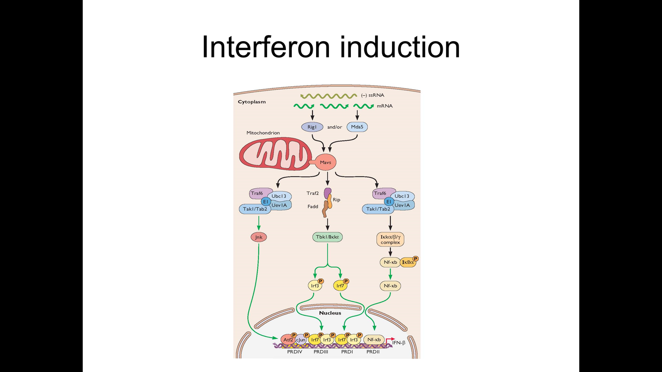 RIG-I like receptors will recognise single stranded RNA in the cytoplasm of the cell It will signal through MAVS (mitochondrial) This will signal further downstream, leading to phosphorylation of IRF3 and IRF7 Theses will dimerise and enter the nucleus to act as a transcription factor Leads to the generation of IFN-beta transcripts Note: Mavs may also activate pathways leading to NFkB activation or Jun kinase activation