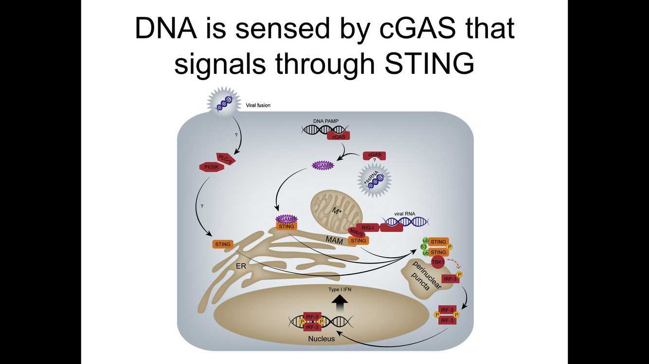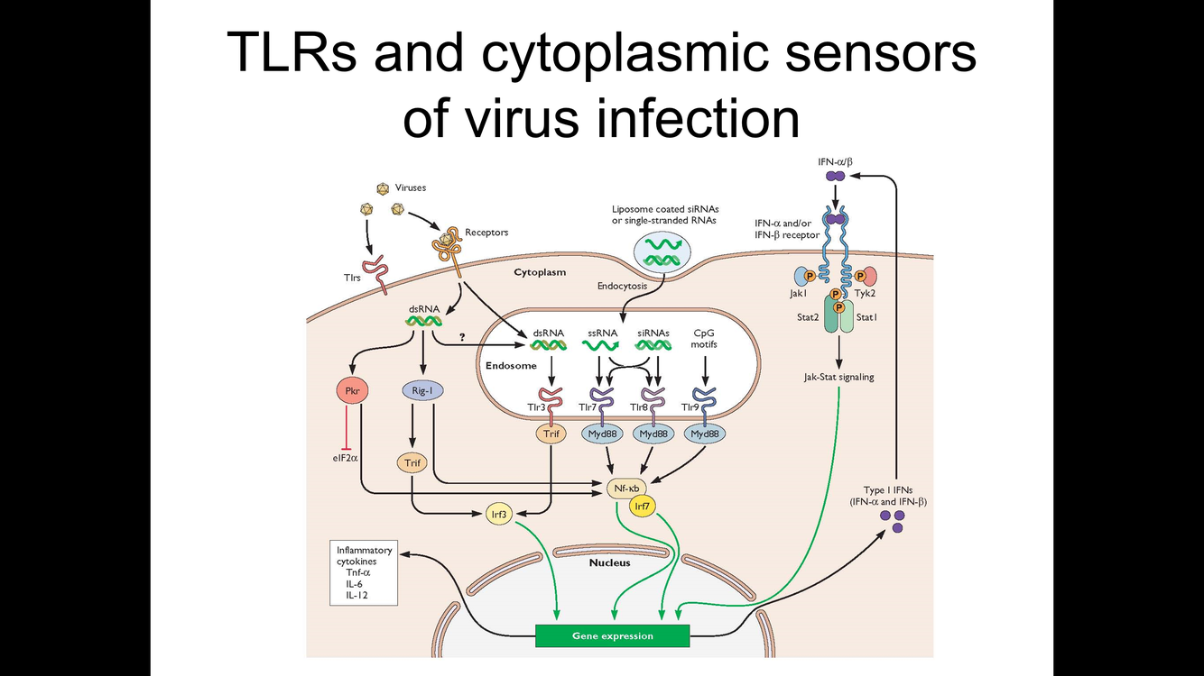 PRRs (pattern recognition receptors) on innate immune cells recognise PAMPs (pathogen-associated molecular patterns) NOTE: they often sense nucleic acids