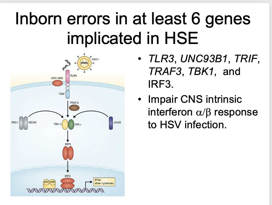 Inborn errors in at least 6 genes are implicated in HSE: TLR3, UNC93B1, TRIF,