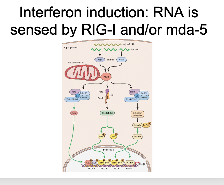RIG-I will then signal through Mavs (located on the mitochondrion), which will then trigger signalling through various different pathways that result in the translocation of molecules from the cytoplasm to the nucleus