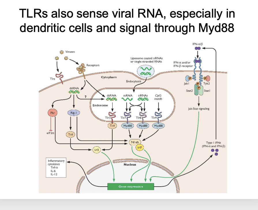 TLR detects nucleic acids in the endosome (this isn’t normal) It will signal to molecules outside the endosome (MyD88) and send various transcription factors to the nucleus It will result in the switching on of expression of IFN alpha