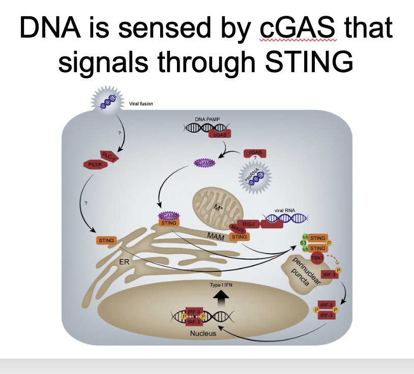 Mainly done by cGAS This is an enzyme that binds to dsDNA in the cytoplasm and synthesises cGAMP (second messenger) cGAMP diffuses to STING (found on endoplasmic reticulum) This triggers phosphorylation of the same sets of transcription factors and signalling molecules the RNA viruses were triggering.