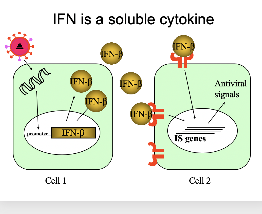 The IFN beta is secreted from these cells, from where it can diffuse and interact with receptors on neighbouring cells