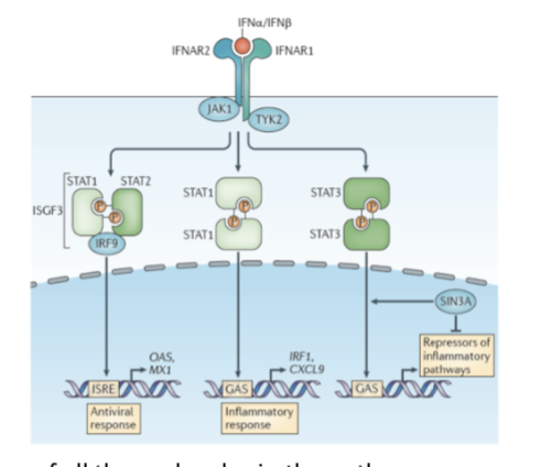 The STAT molecules dimerise and combine with IRF9 - it then goes to the nucleus and binds to a promoter region that is responsive to that transcription factor
