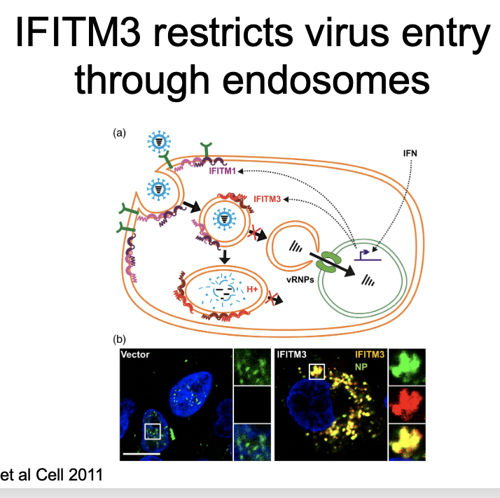 Interferon-induced transmembrane protein 3 These sit on the membrane of endosomes, in cells that have been previously stimulated by IFN It prevents fusion of the virus membrane with the endosomal membrane so the virus gets trapped in the endosome NOTE: mice and people lacking IFITM3 get more severe influenza