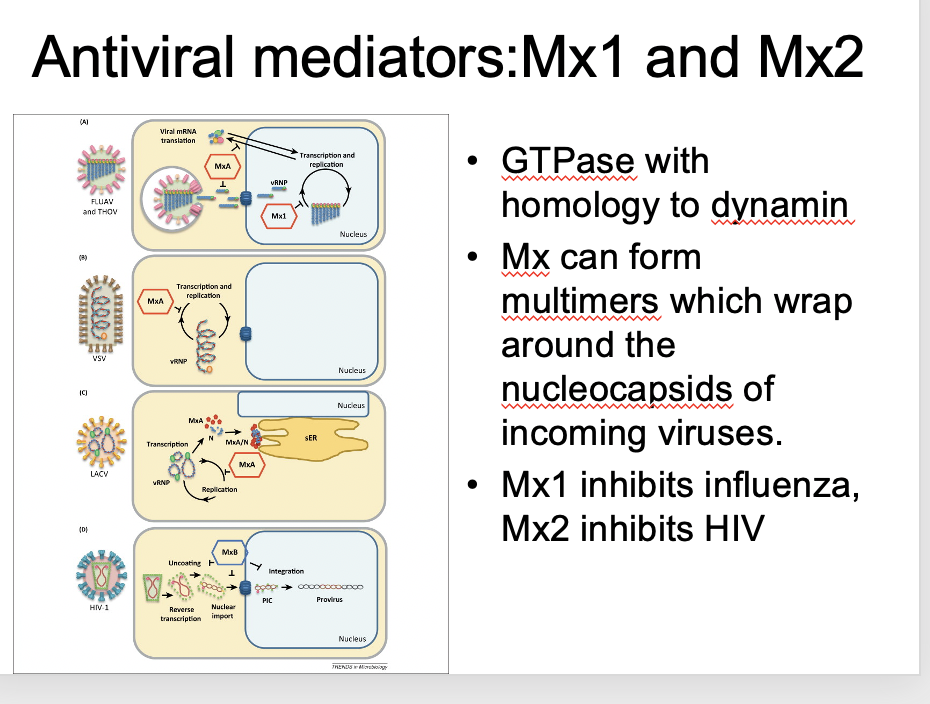 GTPases with a homology to dynamin Mx can form multimers that wrap around nucleocapsids of incoming viruses – this nullifies the viral genomes Mx1 – inhibits influenza Mx2 – inhibits HIV