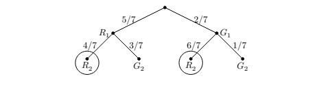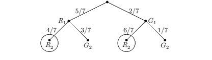 The top node (root node) is at level 0. The next layer down is level 1 and so on. Each level shows the outcomes at one stage of the game. Level 1 shows the possible outcomes of the first draw. Level 2 shows the possible outcomes of the second draw starting from each node in level 1. Probabilities are written along the branches. The probability of π 1 (red on the first draw) is 5/7.