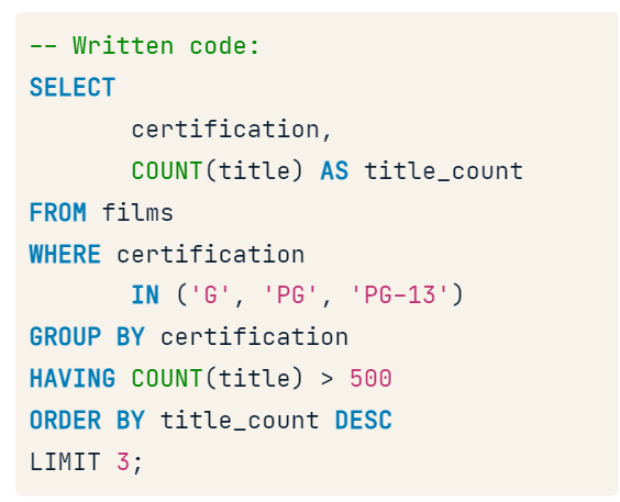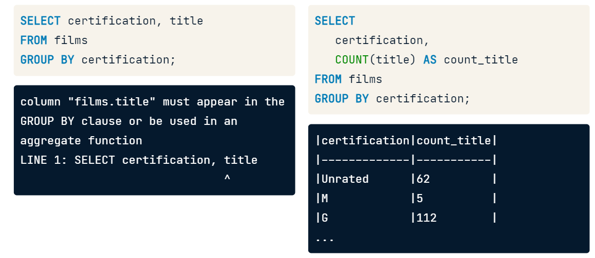 SQL will return an error if we try to SELECT a field that is not in our GROUP BY clause. We’ll need to correct this by doing what?