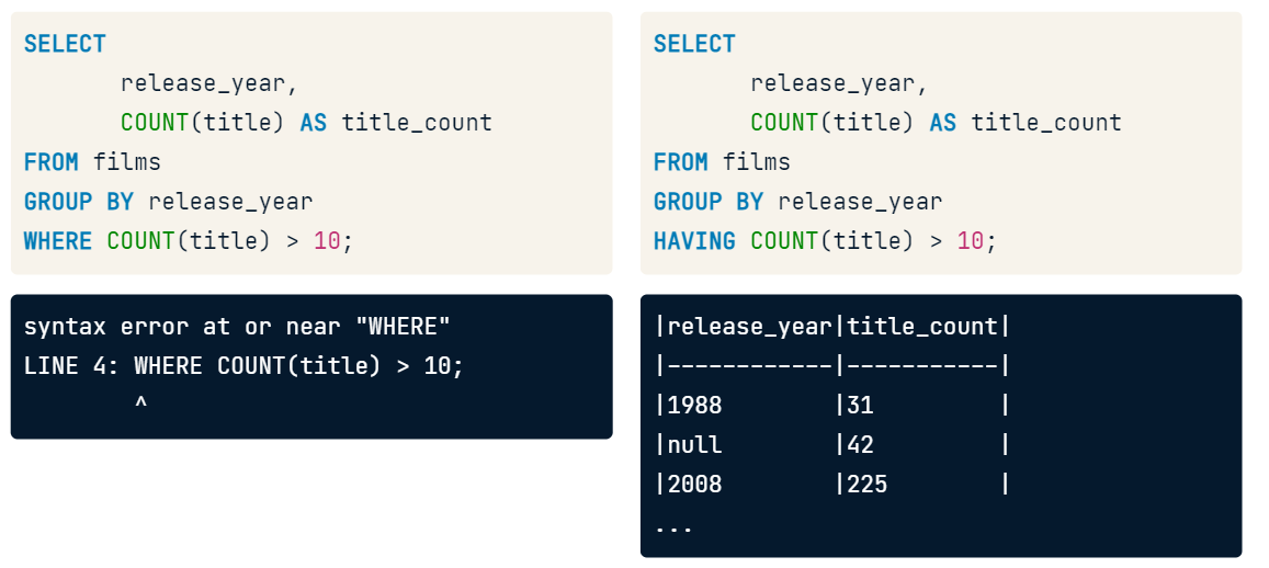 True/False - In SQL, we can filter aggregate functions with WHERE clauses.