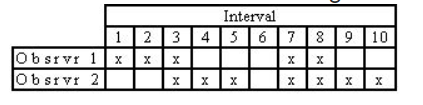 A frequency-within-interval calculation increases the probability that agreements are based on both recorders observing the same behaviors. The calculation is percent agreement for each interval averaged across all intervals. For example, in the first interval, observer one records two occurrences and observer two Records for occurrences (50%). In the second interval, observer one records one occurrence and observer two record three occurrences (33%). The sum of 50%, 33%, etc., would be divided by the total number of intervals.