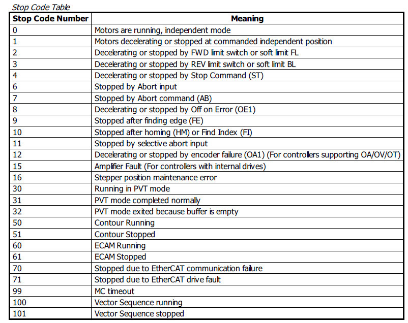 1. The Stop Code command returns a number indicating why a motor has stopped.