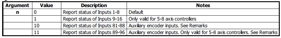 1. The TI command returns the state of the inputs in banks of 8 bits, or 1 byte.
