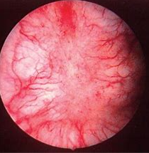 Red inflamed patches of bladder mucosa associated with small blood vessels