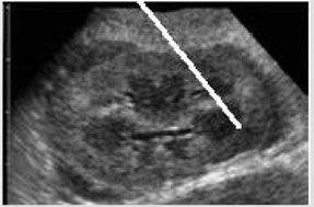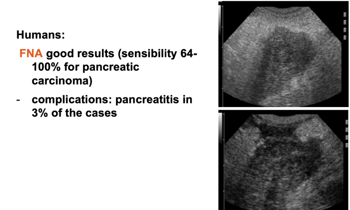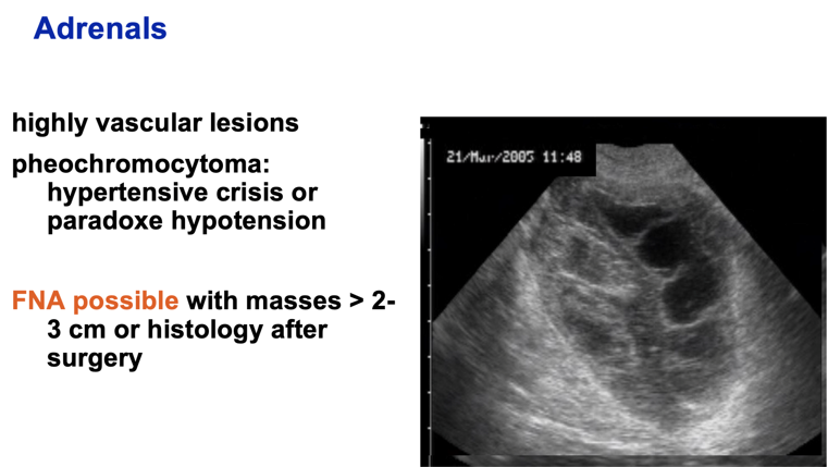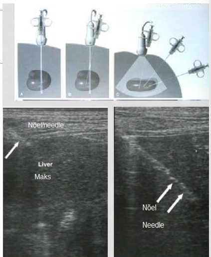 FNA 20-22G: subcapsular fluid, aspiration from the pelvis, cysts, solid lesion, diffuse lesion.
